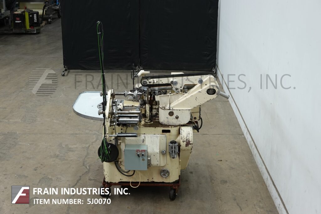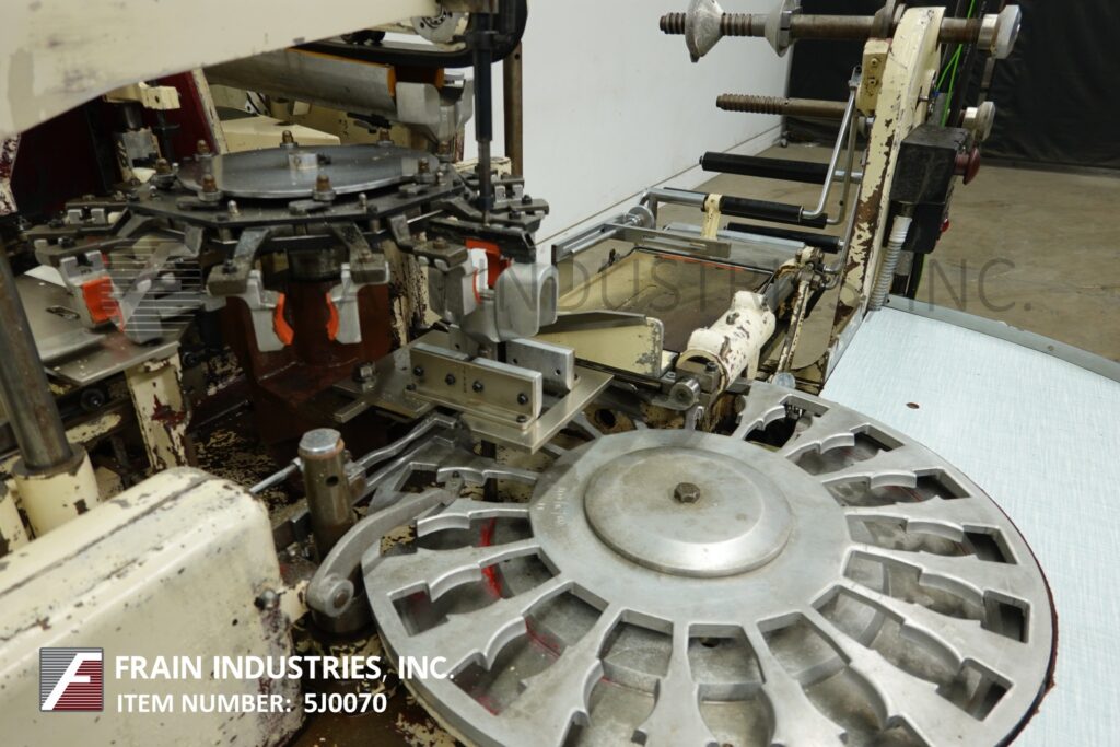 Rasch, Model RUBESTZ, Semi automatic, intermittent motion, bottom fold, foil wrapping machine with number of wraps per minute – depending on materials, application and machine configuration. Equipped with 20¾" OD, 18 pocket hand loaded product disc, 8" wide dual foil film unwind rolls with foil cut-off section and has a product pusher bar thru the cut foil, 8 sets of rotary horizontal product grippers to intermittent motion bottom foil folding section and 32" long x 2" wide product discharge conveyor. Mounted on base frame with casters and leveling legs.
