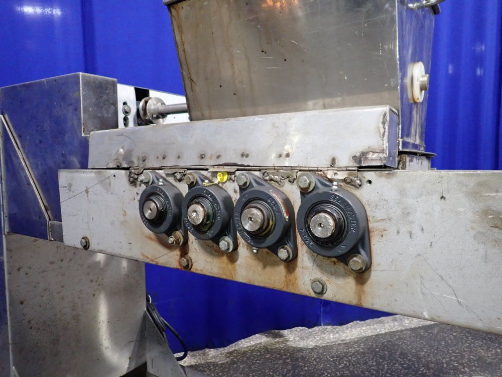Sottoriva Dough Divider, Model SVP08-1, serial number B7482, auto piston divider, rated for 200-1700 gm minimum 660 to 1620 maximum range of capacity per hour with 25" diameter x 20" deep dough hopper, auto duster, with 12" wide x 75" long sanitary discharge conveyor, stainless steel construction., [BID NOW - LOT ...more