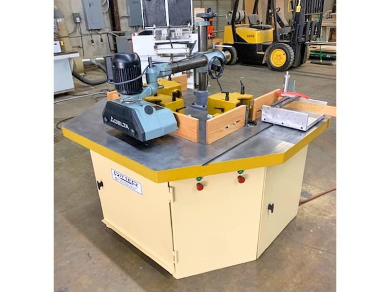 RITTER R-30 3-Head Shaper(3) Shaper spindles mounted in a common base, 52" x 68" worktable; designed for running raised panels, as well as style & rail material for raised panel doors. -- Equipped with: 1-1/4" Dia. V-belt driven spindles powered by (1) 7.5 HP motor and (2) 5 HP Motors; 6,100 & 8,600 RPM spindle speeds and 5-1/2" max. cutter dia. -- 1st Spindle: Setup with "R-10TESA" tenoning attachment, 2" high x 12" wide max. tenon, manually operated with air holddowns; 2nd Spindle: Setup for shaping of raised panels; 3rd Spindle: Setup for machining of style & rail and outside lip of door. -- Includes: DELTA 3-Roll Power feeder. -- Complete with: Dust hoods, and adjustable fences