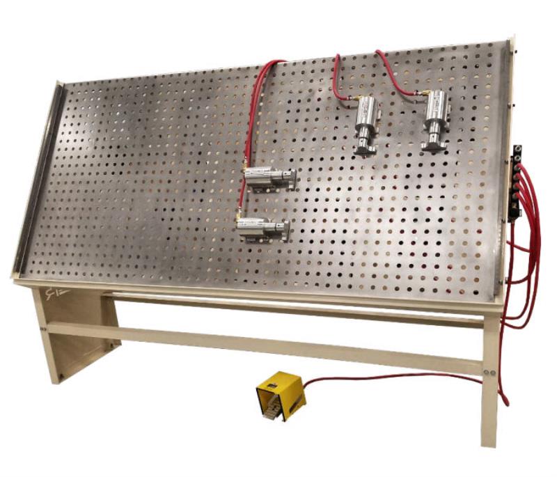 RITTER R-375 V Door and Panel Clamp4' X 8' Cap., 45 Degree Vertical Assembly Easel.Standard Features: -- (6) Universal Clamping Cylinders & Cylinder Manifold. -- (2) Squaring Bars on Left and Right Sides. -- 2" Cylinder Position Grid Pattern. -- 3" Bore Clamp Cylinder Housing. -- Perforated Steel Table. -- (6) Port Manifold with 1/4" NPT Regulator/Gage. -- Adjustable pressure from 20 to 130 PSI. -- Foot Treadle operated.Shipping Dimensions: 53" X 106" X 30" HShipping Weight: 778 LBSNOT IN STOCK - CALL OR EMAIL FOR CURRENT LEAD TIME TO SHIP. PRICING SUBJECT TO CONFIRMATION.
