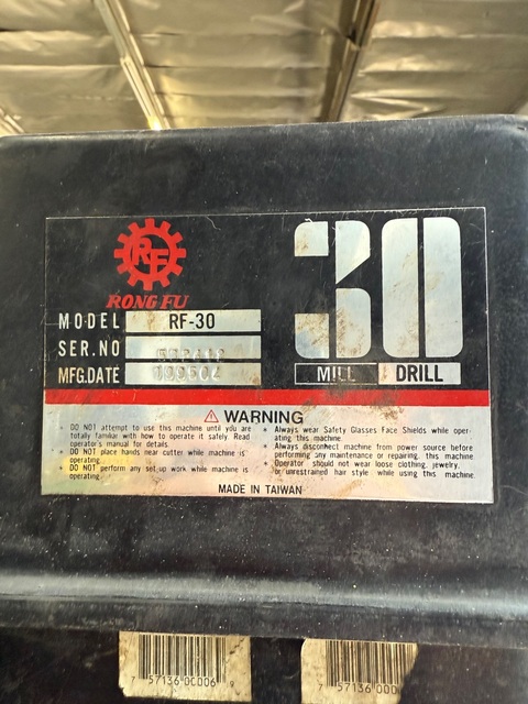 Rong Fu #RF-30, Vertical Mill/Drill, 150-3000 RPM, R-8 spindle Manufacturer: Rong Fu Model: RF-30 Stock # 7633 Price: $1,150 USD Request Info 5 For Sale by Wheeler Machinery Sales Surplus Record Dealer Since 1998 Contact Seller Pomona, CA Dan Wheeler 909-34...> Show Seller's Phone Number 909-348-5610 Let the seller know you found their listing on Surplus Record! View More Wheeler Machinery Sales ' ListingsDescription Rong Fu RF-30 Vertical Mill/Drill #7633 #1SPECIFICATIONS:Drilling Capacity: 1-1/4"Face Mill Capacity: 3"End Mill Capacity: 3/4"Swing: 16-3/8"Nose to Table: 18"Spindle: R-8Spindle Travel: 5"Quill Diameter: 3"Head Swivel: 360Column Diameter: 4-1/2"Number of Spindle Speeds: 12 Speed Single SpeedRange of Spindle Speeds (RPM): 150-3000Maximum Table Travel: 19-3/4"Cross Travel: 7"Working Surface of Table: 8-1/4" x 28-3/4"T-Slot Size: 5/8"Overall Dimensions: 42-1/2"L x 39-3/4"WNet Weight: 660 lbs. Request More Information from SellerInquire Further with Wheeler Machinery Sales! "*" indicates required fieldsName*Company*Email* PhoneZip / Postal Code*QuestionMake an OfferRequests Send me a shipping quote I am interested in financingSend Copy Email me a confirmation of this inquiryBuyer Protection Use our partner Escrow.com to buy or sell equipment safelyBuyer Protection Send me info about buyer protectionThis field is hidden when viewing the formDealer Email Buyers Who Viewed This Listing Also Viewed … RF #105-1120, Mill Drill, 8" x24" table, 1.5 HP, Acu-Rite digital read out, 2014Category: Bed and Knee Milling Machines - Vertic...Seller: Breakthru SurplusLocation: Waukesha, WI Mfr: RfModel: 105-1120Year: 2014 Round Tower #1-1/2, ram type vertical mill, 9" x42" table, 1 HP, forward/reverse, vise, #76541Category: Bed and Knee Milling Machines - Vertic...Seller: Yoder Machinery SalesLocation: Holland, OH Mfr: Round TowerModel: 1-1/2SERIAL. 83051733, MODEL. 1-1/2, AREA OF TABLE. 42" X 9", SPINDLE SPEEDS. (8) 90 TO 2780 RPM, LONGITUDINAL TABLE TRAVEL. 26", CROSS TRAVEL. 12", VERTICAL KNEE TRAVEL. 16", SPINDLE TRAVEL. 5", POWER SPINDLE FEEDS. 0015, 003 & 006 IPR, CHROME WAYS. YES, 1 SHOT LUBE. YES, TAPER IN SPINDLE. R - 8, FORWARD & ...more Republic-Lagun, vertical mill, 10" x44" table, 55-4250 RPM, 16" cross knee travel, 16" vert knee travel, R-8Category: Bed and Knee Milling Machines - Vertic...Seller: Carolina Machinery SalesLocation: Monroe, NC Mfr: Republic-LagunTable Size, 10" X 44", Longitudinal Travel, 24", Cross Travel, 16", Vertical Knee Travel, 16", Spindle Speeds (Variable), 55- 4,250 RPM, Spindle Nose, R - 8, Spindle Quill Travel, 5", Spindle Quill Feeds (3), 0.003" - 0.0015" - 0.006", 230 volt 3-phase. Republic-Lagun #FTV-2S, Vertical Milling Machine w/DRO, 10" x 52" Table, 34.64" X w/Power Feed, 15.98" Y, 15.98" Z, 22.44" Ram, 5" Quill, 55-4250 RPM, 3 HP, 230/460 VCategory: Bed and Knee Milling Machines - Vertic...Seller: Norman Machine Tool LtdLocation: Baltimore, MD Mfr: Republic-LagunModel: FTV-2SRepublic Lagun 10″ x 52″ Vertical Milling Machine with Digital Readout, FTV-2S, Inventory # 9749, Model: FTV-2S, Table Size: 10″ x 52″, Max. Weight on Table: 750 lbs., Table Travels:, X-Axis: 37.99″ (34.64″ with Power Feed), Y-Axis: 15.98″, Z-Axis: 15.98″, Ram Travel: ...moreShare × "*" indicates required fieldsYour Name*Your Email* Recipient's Email* Note to Recipient