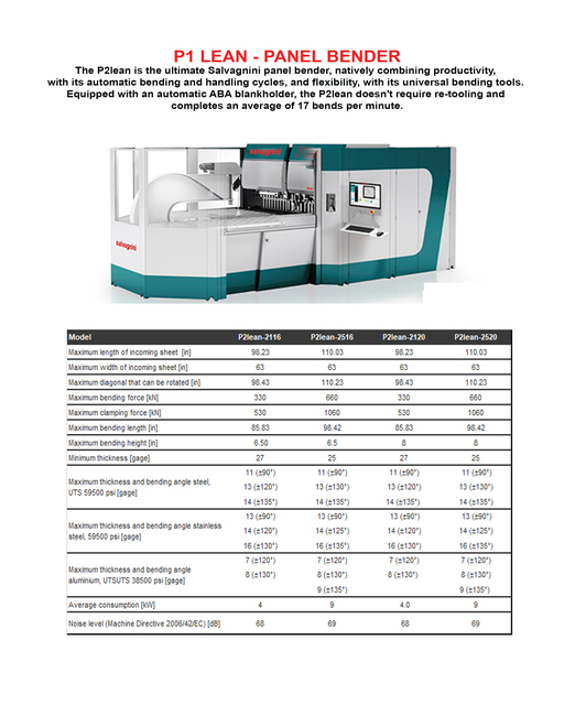 Spec, Bending Length: 98.42″, Weight: 52,000 lbs, Control: CNC (Salvagnini), Maximum Bending Length 98.42″ Maximum Bending Height 6.49″ Maximum Material Thickness 0.118″ Minimum Material Thickness 0.0196″ Max. Bending Angle 135 Deg. Maximum Diagonal of Incoming Sheet 110.23″ Maximum ...more
