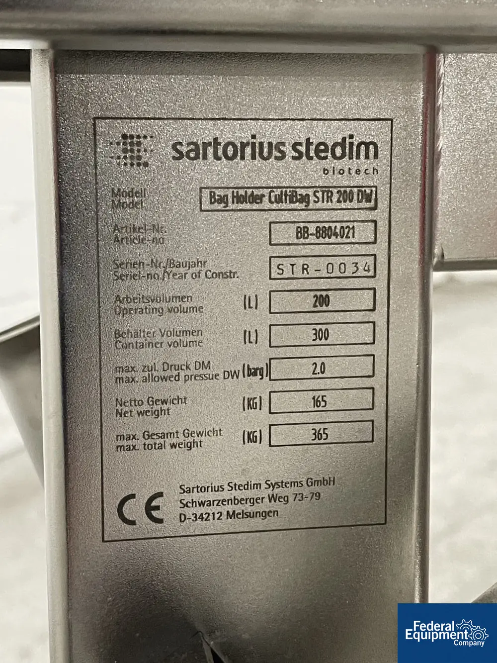 Used 200 liter Sartorius Stedim BioSTAT CultiBag single-bag-use Bioreactor, model STR-200-DW, stainless steel housing, jacketed for 2 bar at -10/+5- c, top mounted servomotor agitator drive, project# BB-8804079, serial# STR-0034, built 2009.