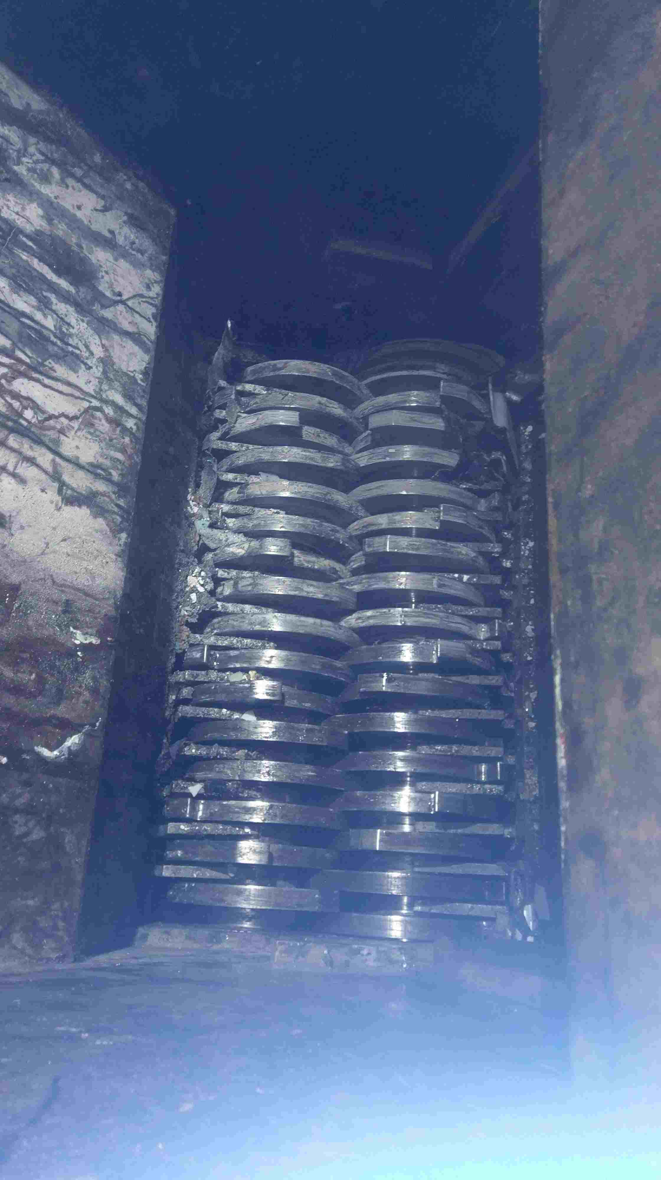 used- retech model vh34/75 horizontal shredder. 5" x 34" in-feed opening, 16" diameter 44 cutter rotor with a 390 rpm rotor speed. rotor is belt driven by a 75 hp 460v 1185 rpm motor. two infeed rollers are powered by approximately 1 kw sew euro drive motors and gearboxes. 41.5" in-feed height. 2" holes screen ...more
