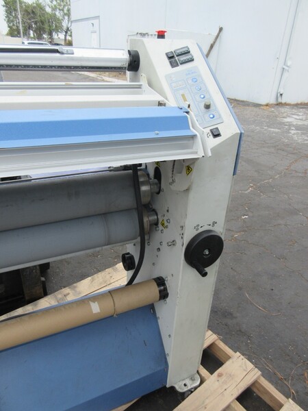 TB60 60" inch Hot Roll Laminating machine, 65" Cap., Top & Bottom Laminator with oil heated chrome plated rollers 14" roller diameter, 25 - 106 FPM, 5 HP feed motor, 48 kW oil heating system, 400° F max., heating including over-temperature cutoff safety device., 1 HP Oil circulation pump, 1.5 HP hydraulic ...more