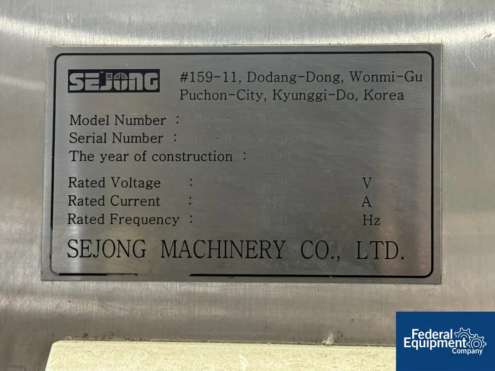 Used Sejong rotary tablet press, model MRC-36N, 36 station, single side feed with force feeder, 16mm max tablet diameter, up to 18mm max depth of fill, rated up to 216,000 tablets/hour, B-tooled, with controls, 220 volts, serial# 0T-00102002, built 2001.