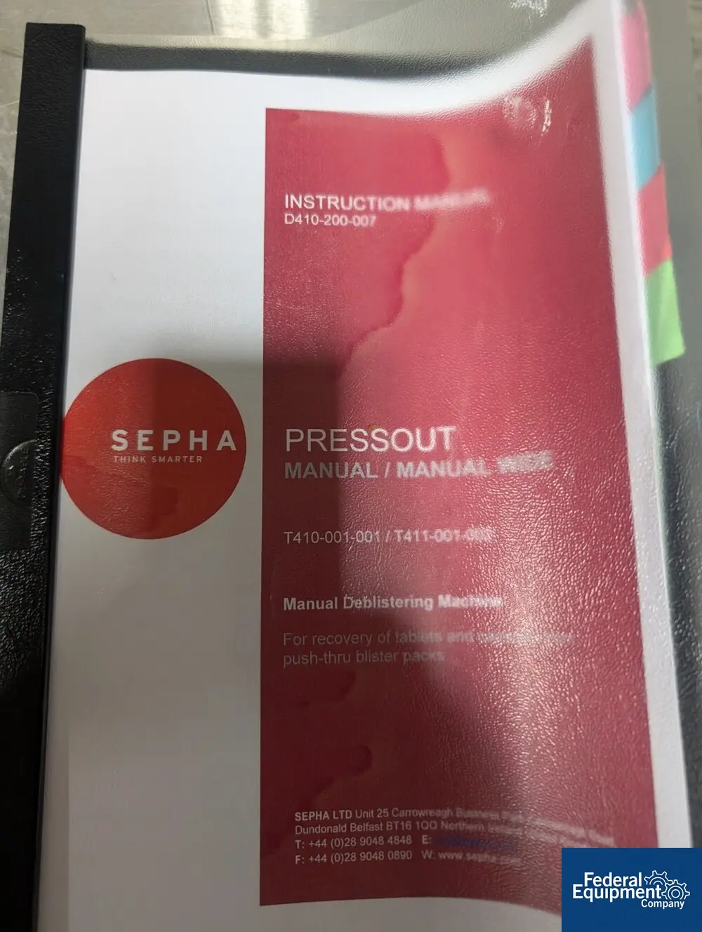 Used Sepha deblistering machine, model PRESSOUT, manual operation, with (3) size plates, serial# 411-212, built 2017.