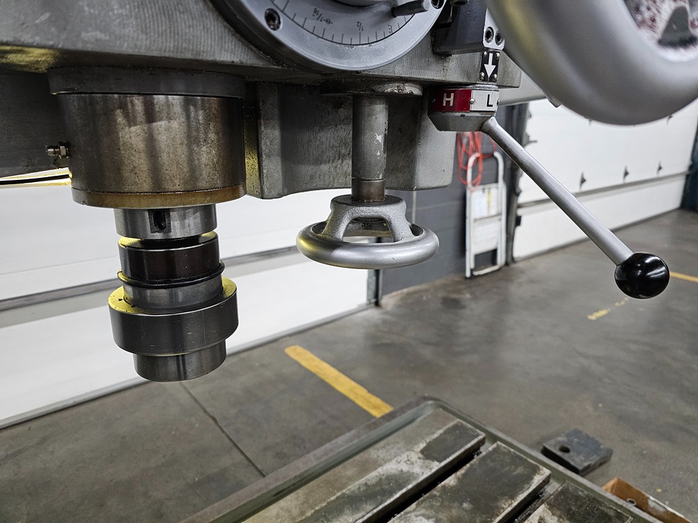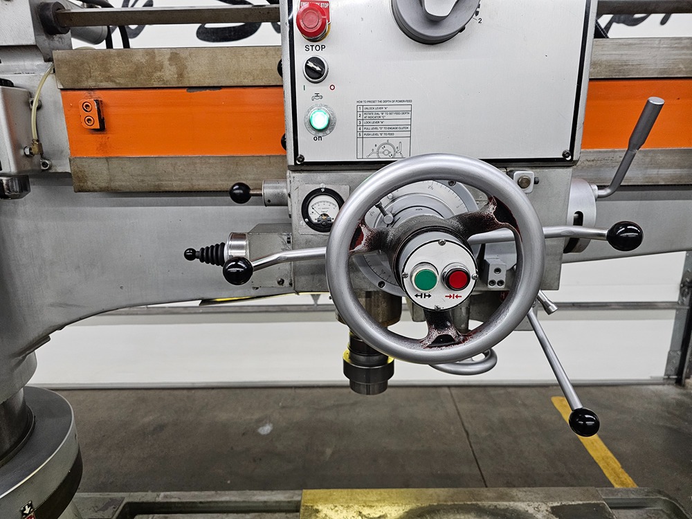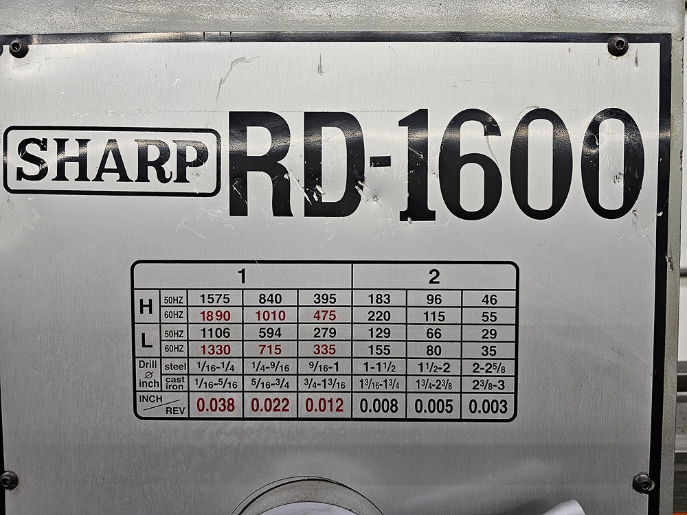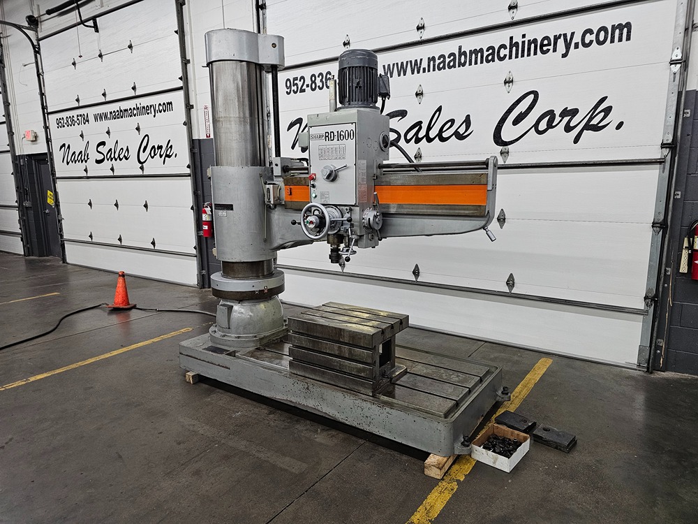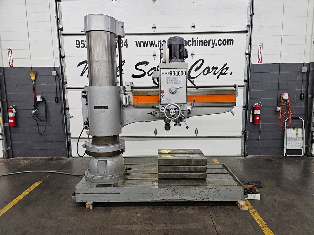 Sharp #RD-1600, box table, coolant system, built-in automatic tool ejector, automatic spindle reverse for tapping, 2013 Manufacturer: Sharp Model: RD-1600 Year: 2013 Stock # 14704 Price: $24,900 USD - Finance for as low as $505/mth Estimated monthly payment valid upon approved credit. Request Info 10 Play VideoFor Sale by Naab Sales Corporation Surplus Record Dealer Since 2007 Contact Seller Blaine, MN J.Van Heuveln 952-93...> Show Seller's Phone Number 952-933-6755 Let the seller know you found their listing on Surplus Record! View More Naab Sales Corporation 's ListingsDescriptionHere We Have:Sharp Radial Drill Model RD-1600 New in 2013Make: Sharp IndustriesModel: RD-1600Serial Number: 20011New in: 201317” column diameterMT#5 spindle, 7.5 HP motor63” column to spindle centerDrilling : 2.63” cast iron, 2.25” steelBoring : 7.37” cast iron, 5” steelHardened and ground arm slide ways and gearsDouble tube column design to increase rigidityArm elevation controlled by electric motorBuilt-in automatic tool ejectorSafety device prevents arm from dropping even when bronze nut is worn outT-slots and drain channels on box tableBox tableCoolant systemAuto spindle reverse for tappingWork lightTool boxSpecifications:Diameter of column: 17”Distance from column surface to spindle center, max.: 63”Distance from column surface to spindle center, min.: 13.37”Travel of spindle head: 49.62”Distance from base surface to spindle end, max.: 63”Distance from base surface to spindle end, min.: 13”Elevating height of arm: 35.43”Effective area of table: 27.62” x 19.62” x 15.75”Dimensions of base: 97.62” x 41.34” x 8.25”Taper hole in spindle: MT #5Stoke of spindle: 14.56”R.P.M. of spindle (rpm range x steps): 40-1920 x 12 StepsFeed of spindle (1PR x steps): 0.003-0.038” x 6 StepsMain motor: 7.5 HPElevating motor: 2 HPClamping motor for column and gear-box: 1 HPClamping motor for arm: 1.5 HPCoolant pump: 1.12 HPMachine height from floor, max.: 10.40’Measurement (LxWxH) / Floor Space: 8.5’ x 3.75’ x 8.75’Measurement (LxWxH) / Shipping Dims: 9.16’ x 4.75’ x 9.58’Approximate shipping weight: 10,340 Lbs.Cast Iron:Drilling: 2.62”Capacity Tapping: 2.37”Boring: 7.37”Steel:Drilling: 2.25”Capacity Tapping: 2”Boring: 5”Total Power Consumption (440V): 12 KVA/17.5 amps Request More Information from SellerInquire Further with Naab Sales Corporation! "*" indicates required fieldsName*Company*Email* PhoneZip / Postal Code*QuestionMake an OfferRequests Send me a shipping quote I am interested in financingSend Copy Email me a confirmation of this inquiryBuyer Protection Use our partner Escrow.com to buy or sell equipment safelyBuyer Protection Send me info about buyer protectionThis field is hidden when viewing the formDealer Email Buyers Who Viewed This Listing Also Viewed … 5' -13" Sharp #RD-1600, radial arm drill, 35.5" elevating height of arm, #5MTCategory: Radial DrillsSeller: Yoder Brothers MachineryLocation: Toledo, OH Mfr: SharpModel: RD-1600Dimensions114" L x56" W x 115" H, MODEL. RD-1600, COLUMN DIAMETER. 17", COLUMN TO SPINDLE. 13" - 63", TRAVEL OF SPINDLE HEAD. 49.6", SPINDLE TO BASE. 13" - 63", ELEVATING HEIGHT OF ARM. 35.5", AREA OF TABLE. 27” x 19" x 15", BASE DIMENSTIONS. 98" X 41" X 8", TAPER HOLE IN SPINDLE. MT#5, SPINDLE (RPM ...more 5.2' -17" Sharp #RD-1600, radial arm drill, #5MT, 1920 RPM, 7.5 HPCategory: Radial DrillsSeller: Southern Fabricating Mchy SalesLocation: Lithia, FL Mfr: SharpModel: RD-160063" X 63" Capacity Radial Drill Press with #5MT, 1920 RPM, 7.5 HP Spindle Drive, Hardened & Ground Arm Slideways, Electric Elevation Drive, T-Slots and Drain Channel in Base Casting, Box Table, Integrated Coolant System and Worklight, Diameter of column: 17"Distance from column surface to spindle center ...more Rong Fu #128-4000, radial arm drill, 15" travel, #3MT, includes pump, 1997Category: Radial DrillsSeller: Southeast Missouri Machine Co IncLocation: Cape Girardeau, MO Mfr: Rong FuModel: 128-4000Year: 1997 28"-8" Summit #RD2808, Radial Arm Drill, 8.25" spindle travel, 88-1500 RPM, 2 HP, 1.5" drill capacity, manual clamp, coolant, unusedCategory: Radial DrillsSeller: Smith Machinery CoLocation: Ames, IA Mfr: SummitModel: RD2808Capacity:, Drilling capacity: 1.5” Spindle motor: 2 HP Distance from spindle axis and column: 7.5” / 28”, Column diameter: 8” Taper in spindle: 4 MT Spindle travel: 8.25” Spindle speeds: 6 Range of spindle speeds (RPM): 88 - 1500 Spindle feeds: 3 Range of feeds: (IPR).003",.0052",.009" ...more Ooya #RE2-1300A, radial drill press, #5MT, 29" x 50" table, 25-5/8" stroke, 48" throat, 7.4 HPCategory: Radial DrillsSeller: FMI Trading LLCLocation: Vinton, TX Mfr: OoyaModel: RE2-1300AShare × "*" indicates required fieldsYour Name*Your Email* Recipient's Email* Note to Recipient