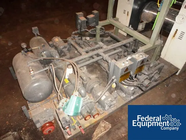 Used 34" Cincinnati Milacron two roll sheet stack, 18" diameter x 34" roll face width rolls, vertical stack orientation, chromed and cored rolls with rotary unions, silent chain driven with 5 hp, 1750 dc motor thru Koellman gearbox with 18.131:1 ratio, scr motor controller, pull roll stand with 4" diameter x 34" wide rubber roll driven by 1 hp dc motor with scr controller with idler roll unitized with temperature control skid, electrically heated with 9 KW Watlow heaters thru shell and tube heat exchanger with pumps and reservoir.