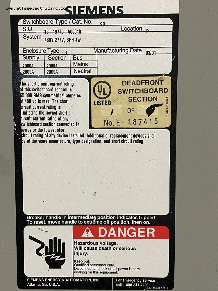 2000 Amps, Siemens #SB, Low Voltage Switchboard 277/480Y Volts