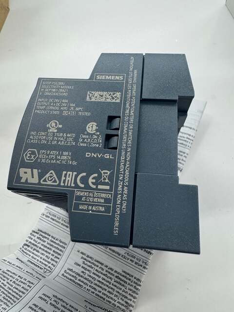 The Siemens SITOP PSE200U is a 24VDC selectivity module designed for use in industrial automation and control panel installations. It accepts a single DC 24V input at up to 40A and distributes power across four independently protected output channels, each rated at up to 10A. Each output channel features an adjustable current threshold via front-mounted potentiometers, allowing protection settings to be dialed between 3A and 10A per channel. Four individual status LEDs provide visual indication of channel state, and a reset function is accessible directly from the front face.
