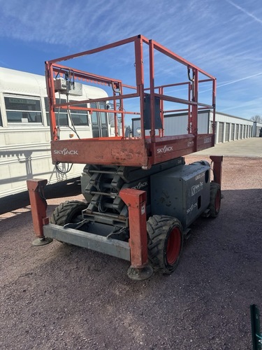 2017 Skyjack SJ6832RT rough terrain scissor lift featuring a 32 ft platform height, 68″ narrow width, hydraulic outriggers, and reliable Kubota dual-fuel engine, ideal for construction and outdoor elevated work.