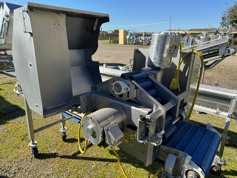 Used Koch model SR2 dicer slicer, stainless steel, 5 HP motor. Product length.04 to 1.25, cuts per min 160 to 320, product temp 28 deg F to 150 deg F. Product output 2200 lbs. 230V with step up transformer to 400V motor (internal)., KOCH SR2.
