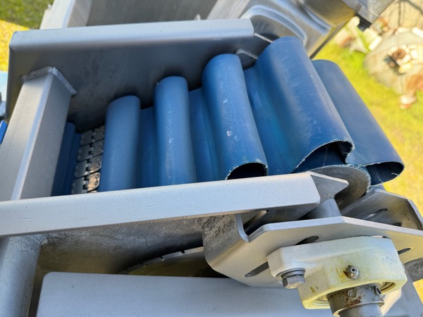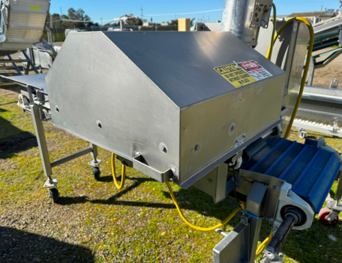 Slicer for cutting elongated vegetables with the ability to top / tail products, manufactured by F.I.R.M. Inc. Offered with blue belting including low-profile cleats, spaced at 1-1/2", to align products to the far side of the conveyor before passing through the slicing blade. It includes a small stainless steel feed chute mounted above the belting. The belt measures 16" wide X 8' overall length and is equipped with a top hold-down belt through slicing section, guiding products to a 12" diameter high-speed slicing blade. Cut-off product tops discharge through a 6" x 2" dimpled chute, good product discharges off cleated belt. The blade is driven by a 1 HP direct connect motor, 1750 RPM, 208-230/460V. The main conveyor is drive-less, and the top hold-down belt is driven by a 1 HP right-angle gear motor. Previously used as green onion root topper for the processing and packaging of bagged salads. All components are mounted on a stainless steel frame with casters.