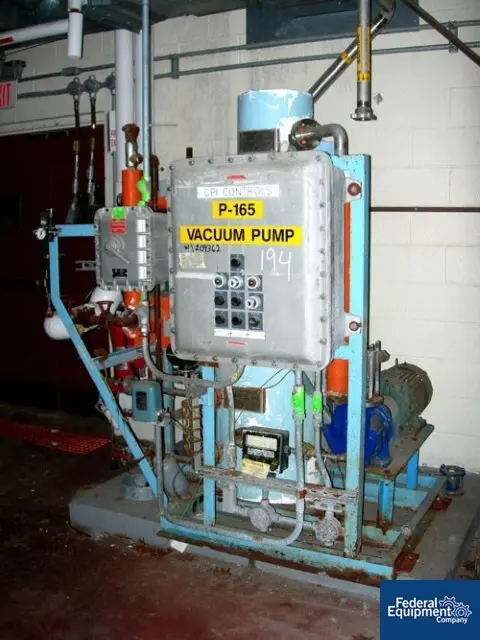 Used APOVAC solvent recovery system, model 1.5/660 with model PMSH156-D2 Sulzer Burckhardt liquid ring vacuum pump with 10 HP 230/460 volt XP motor, (2) heat exchangers, (1) receiver tank, skid mounted with control panel, serial# 62.5.6031, new 1990.