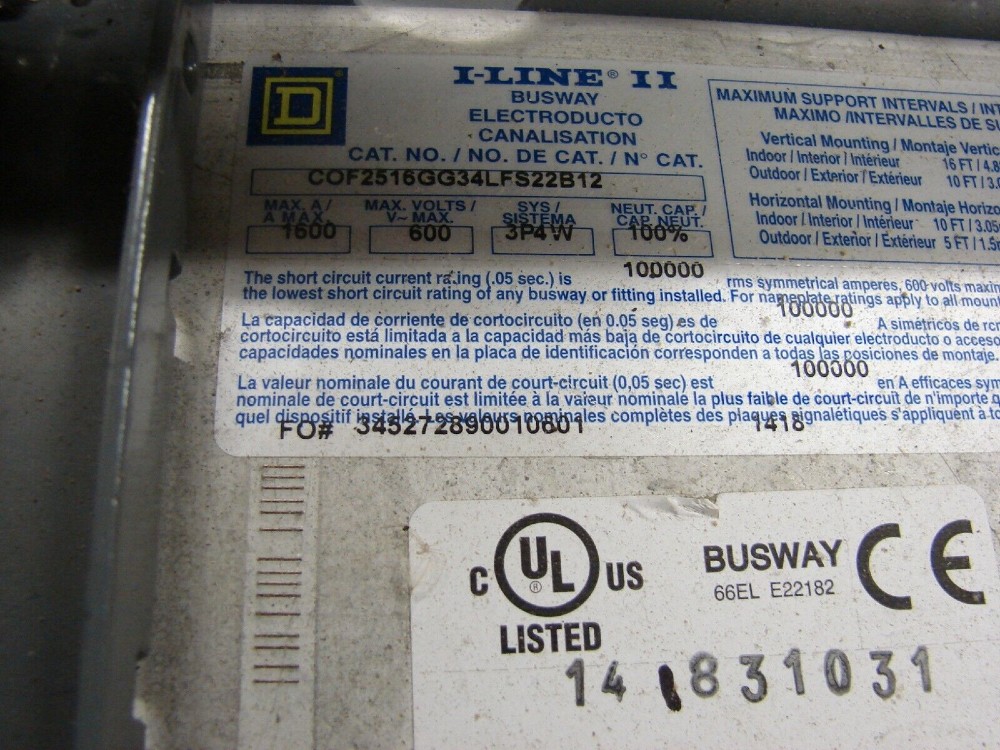 SQUARE D 1600 AMP BUSWAY, AP2516G10: 1600 AMP, 480VAC, 4 WIRE, 100% RATED NEUTRAL, ALUMINUM, I-LINE II, AP416: 1600 AMP, 480VAC, 4 WIRE, 50% RATED NEUTRAL, ALUMINUM, I-LINE II, CP2516G10: 1600 AMP, 480VAC, 4 WIRE, 100% RATED NEUTRAL, COPPER, I-LINE II, CF2516G10: 1600 AMP, 480VAC, FEEDER DUCT, 4 IRE, 100% RATED ...more