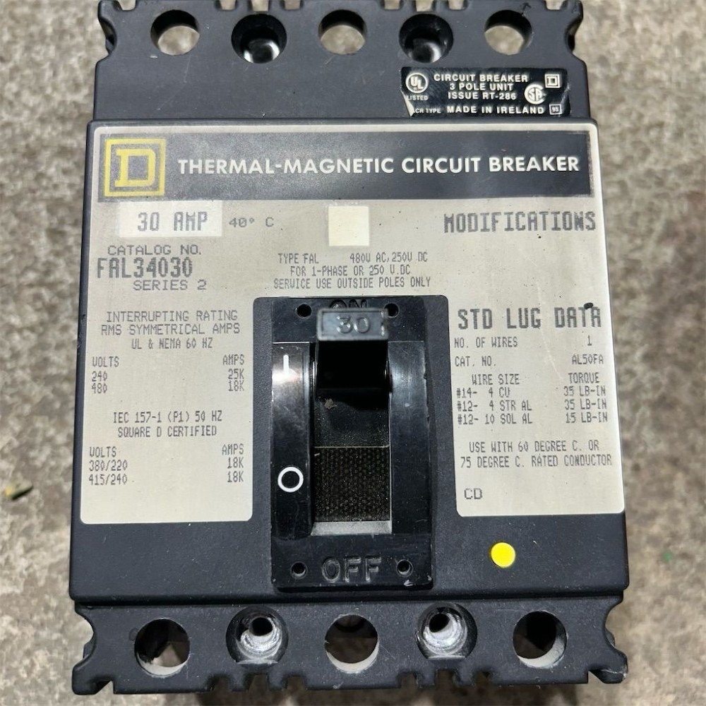 For sale is a Square D FAL34030 Molded Case Circuit Breaker. This unite is rated for 30 Amps, 3 Pole, with voltage ratings of 480 VAC. Built for durability and reliable performance, this breaker is widely used in industrial and commercial electrical distribution systems.