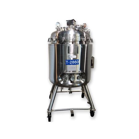 Used 316L Stainless Steel Jacketed Portable Reactor Holding Tank - 500L Capacity National Board Certified by Stainless Technology (NB #130) Tank has a 34" internal diameter and a 33" vertical straight side. Top dished cover is multi-ported and installed with a 24KW imersion heater. Cover is missing the hold down clamp bolts and o-ring gasket. Bottom dish is jacketed with bottom center drain (installed aseptic radial diaphragm valve). VESSEL: Material: 316L stainless steel Wall Thickness: 0.1874" shell; 0.3125"/0.1874" heads MAWP: 50PSI @ 350 F; MAWV: -15PSI @ 350 F