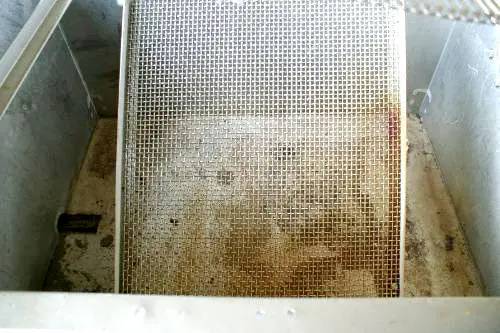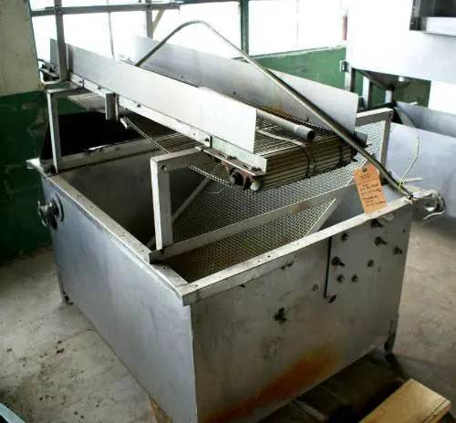 Rectangular Tank with Dewatering Conveyor. Tank dimensions: 3 ft. 6 in. W x 4 ft. 6 in. L x 2 ft. 4 in. D. Conveyor dimensions: 15 in. W x 5 ft. L. Estimated capacity: 275 gallons.