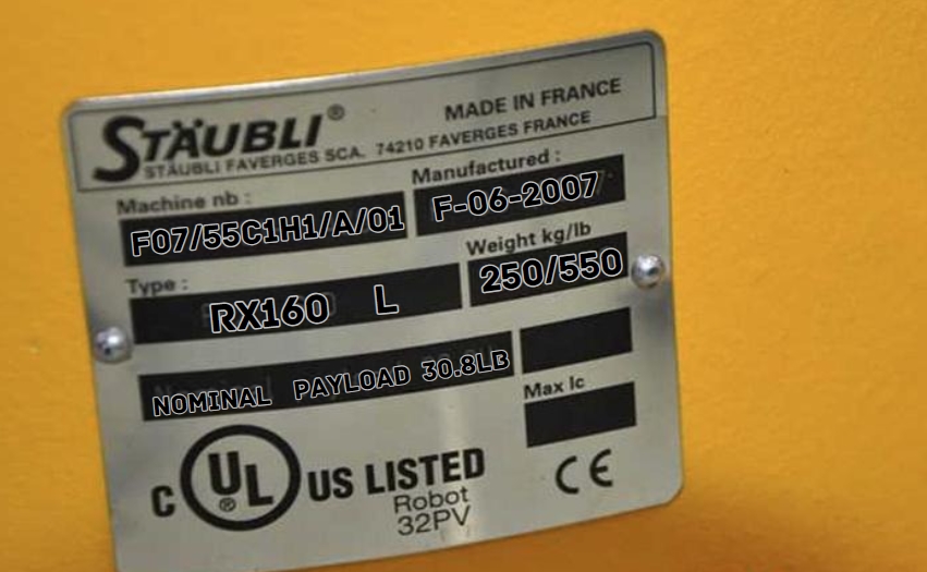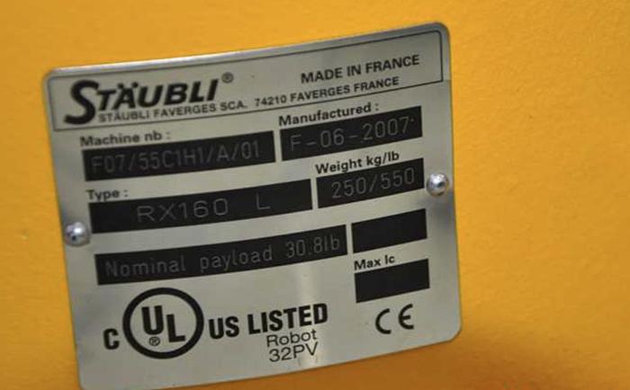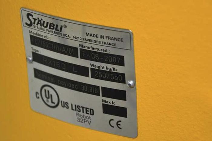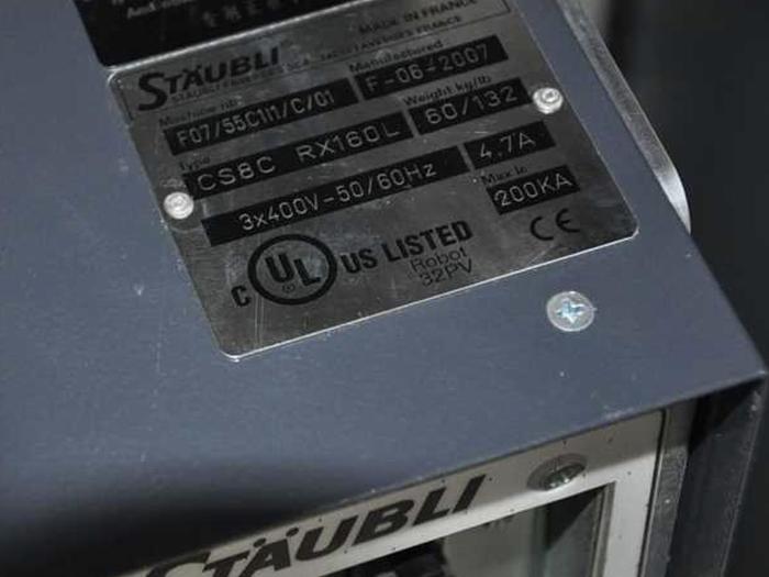 Staubli RX160 L Robot F15/50HBA1/A/01Brand StaubliModel RX160LType Robot ArmAxes 6Payload 14 kgReach 1900 mmRepeatability 0.05 mmWeight 250 kg, Stubli RX160 L.