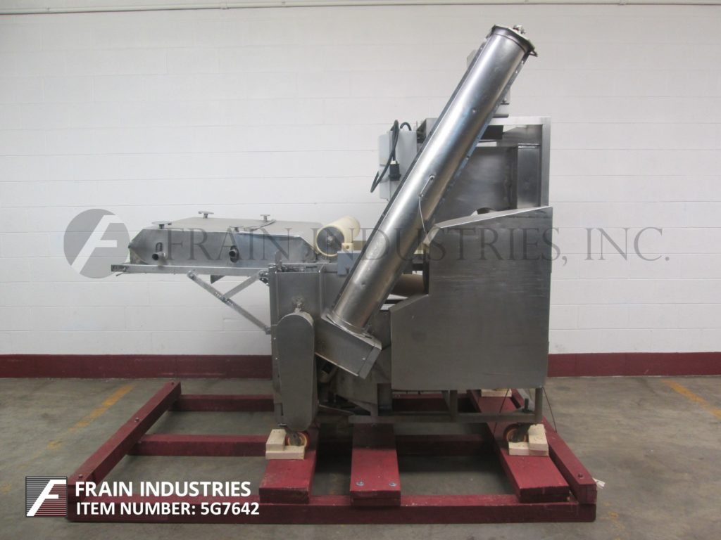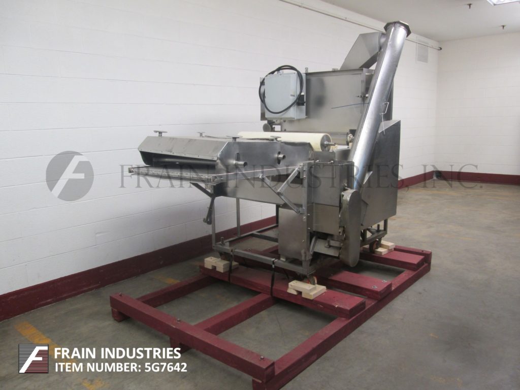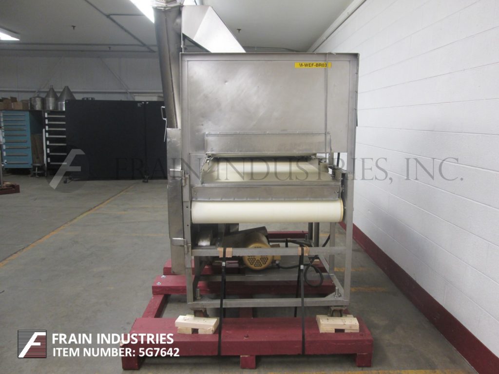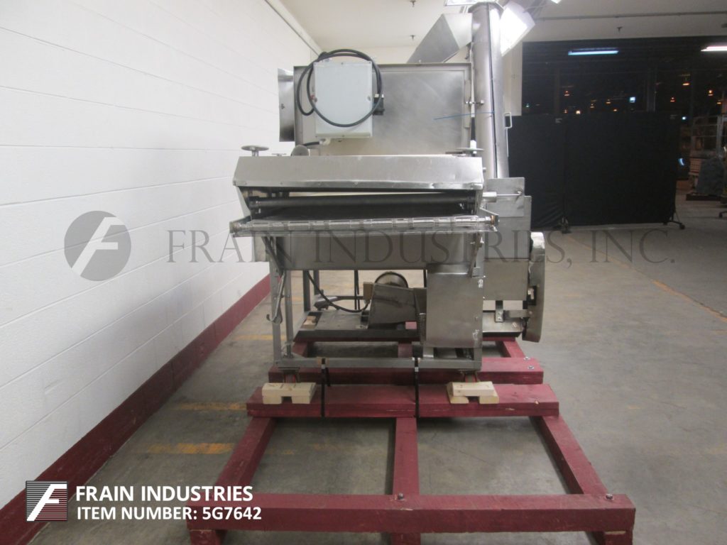 Stein Model Heritage, Automatic stainless steel breading applicator with number of product per hour – depending on materials and application. Capable of running flour and fine granular free flow coating materials. Equipped with a 36" wide x 36" long product in feed conveyor belt with 27" wide top applicator and bottom breading reservoir to cover belt and fully coat product, 30" wide x 35" long stainless steel wire product discharge belt with hooded blow off for excess breading removal. Coating material is transferred from filling station to top applicator by a 7½" diameter x 65" long stainless steel screw conveyor and further transferred to bottom station with a 3" diameter x 28" long stainless screw conveyor. Unused breading from conveyor belt is returned to the filling station by a 6½" diameter x 50" long stainless steel screw conveyor. Mounted on stainless steel base frame with casters.