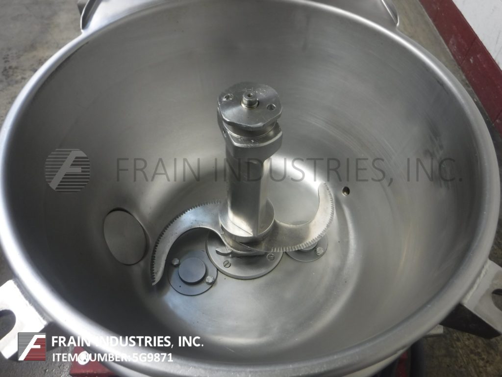 Stephan, Model UMM SK-25, 25 liter, vertical, vacuum cooker and chopper with number of pounds of product per hour – depending on materials, application and machine configuration. Equipped with 17" ID x 9½" deep stainlees steel mixing bowl, internal steam jet nozzle, (2) 6" long bottom chopper / mixing blades, 90° tilt, flip up / bolt down cover and low pressure jacket. Manual top handle side scrapper and two speed (1750 / 3500 rpm) (5.3 / 6.7) Hp bottom chopper blade motor drive with speed selection switch. Mounted on (4) leg base frame.