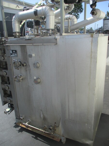 Alfa Laval Steritherm PHE Sugar Sterilizer System rated for approximately 35 GPM product flow and 1.5 GPM steam input. Designed for aseptic thermal treatment with a maximum sterilization temperature of 284F and pressure rating of 140 psi (10 bar). The system includes a 1000L balance tank, insulated holding cell ...more