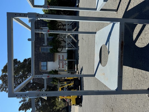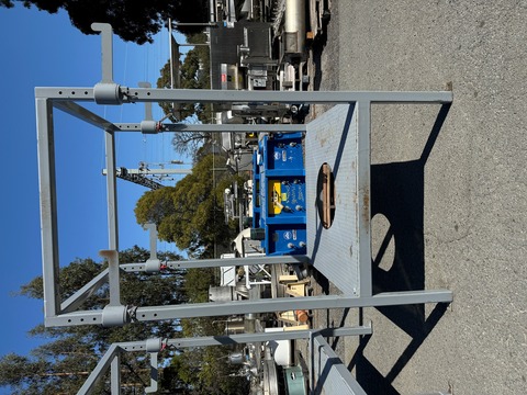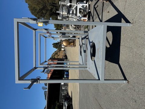 Heavy-duty supersack unloading frames designed to lift and hold 2,000-pound bulk bags for material discharge. The frame features a bottom platform with a large diameter opening, providing approximately 16" of clearance for efficient bag unloading. Previously connected to discharge augers mounted underneath. Max capacity: 2,000 lbs. This equipment was last used in an animal feed processing plant