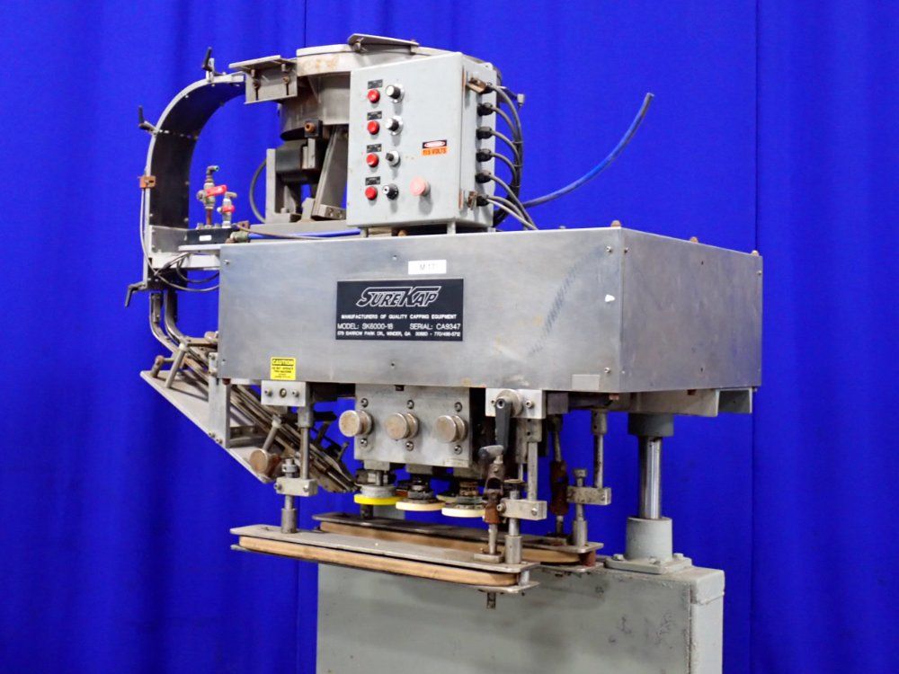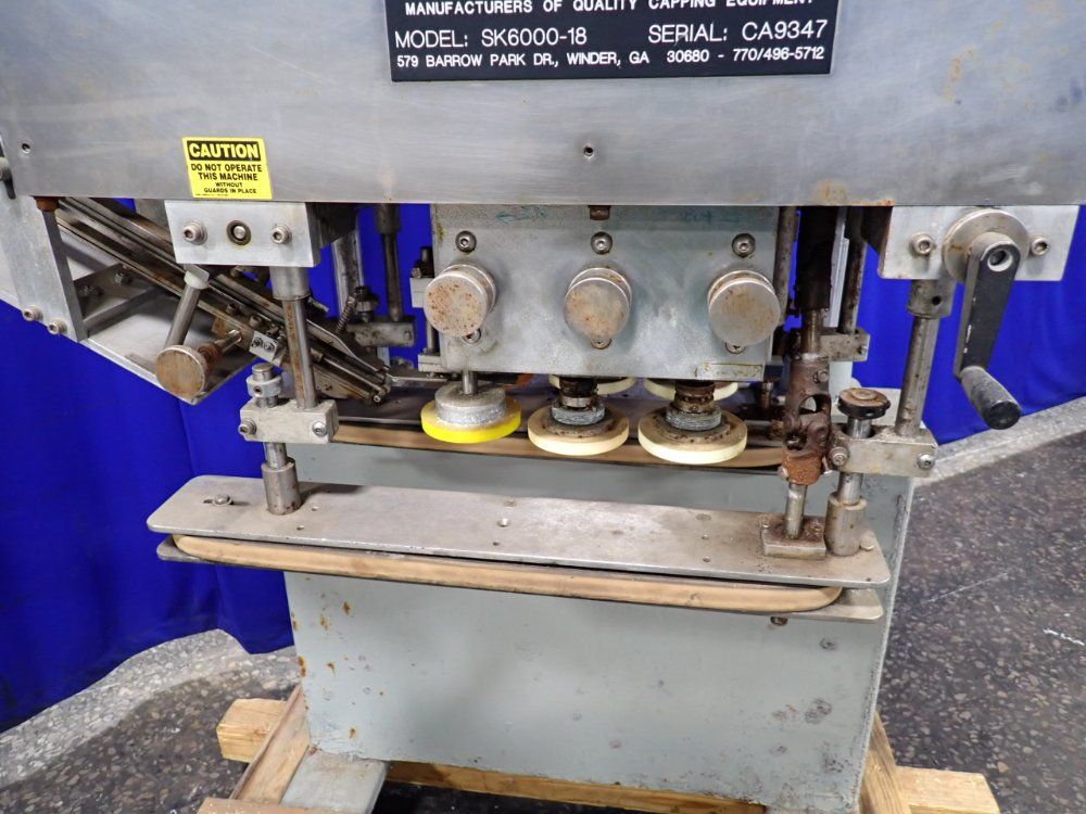 SureKap Model SK6000 BF6-70, automatic, inline, stainless steel, 3 station, 6 spindle roll capper., Cap size range: 22mm to 70mm. 120" long x 4-1/2" wide conveyor, 4 ft³ cap hopper, 46" long x 5½" wide cap feeding / sorting belt, adjustable cap chute, with 24" long x 1" wide ...more