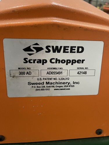 Sweed #300AF, scrap chopper, easy to reach Feedworks Release hand lever, s/n #25540002, unused