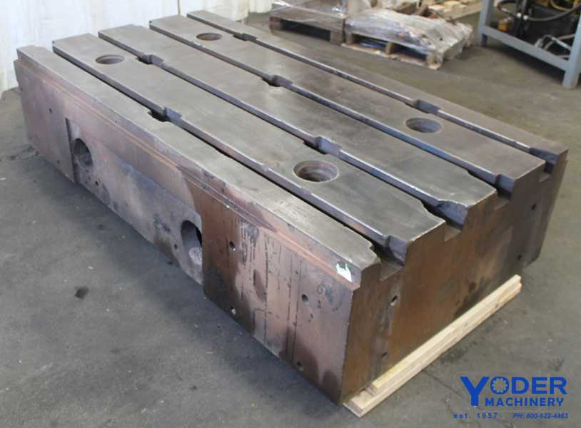 # OF T SLOTS. 3, T SLOT CENTER. 10.5", WIDTH OF T SLOTS TOP. 3/4", WIDTH OF T SLOTS BOTTOM. 1-1/2", Machine Type.Tables, Floor & Layout Plates Manufacturer.N/A Model.N/A Year.N/A Condition.Used Width.38 inches Length.122 inches Thickness.8 inches.