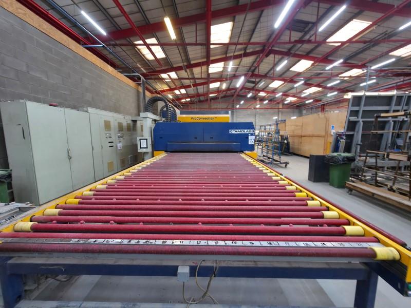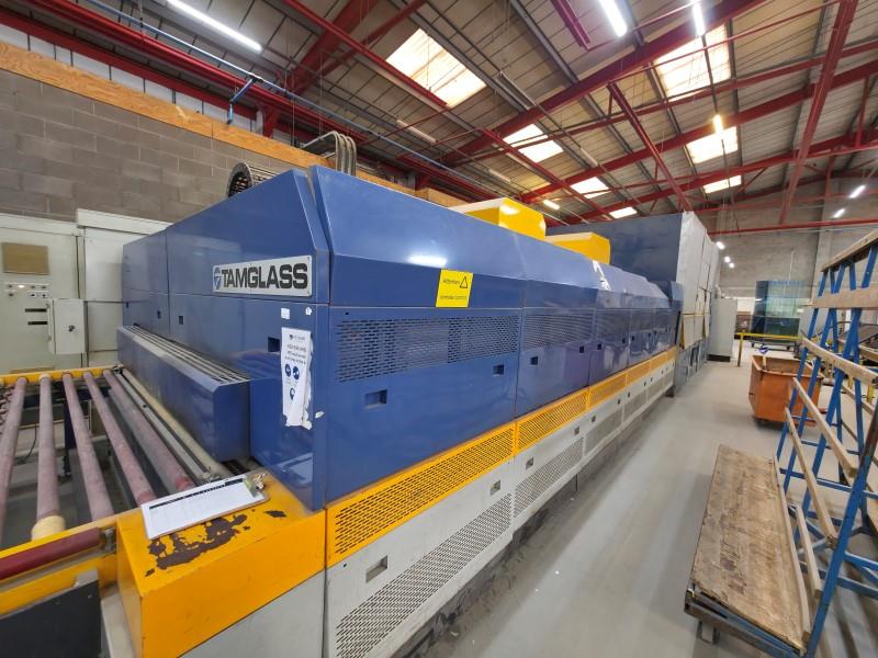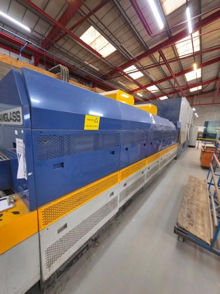 TAMGLASS - HTF CONVECTION PRO E 2448 CTS-20: Flat Glass Tempering Furnace for Low-E GlassesTempering Furnace, which utilizes optimized heating system with convection, which additionally heats the top of the glass for convection purposes. The most important of these are individual heating element controls, individual operation of the furnace modules, and a high efficiency quench system. Low-E glass has: Microscopically thin, transparent coating, much thinner than a human hair; reflects long-wave infrared energy (or heat). Low-E can also reflect significant amounts of shortwave solar infrared energy. This Entire Tempering Line consists of the Following Equipment Components: ● Infeed and Outfeed Conveyors with Lifting Tables ● Heating Station ● Quenching Station ● Noise Reduction Cabin ● Electrical Components Control Station ● PC Based Operator Control Module ● Anti-Scratch Powder Applicator SystemSpecifications● Right-handed model● Min. glass size: 100 x 250 (3.94" x 9.84)● Max. glass size: 2,440 x 4,800 mm (94.1/2" x 189")● Glass thickness: 4 - 19 mm (0.16" - 3/4")Max. Glass size: ANSI Z97.1-1984 / EN 12150● 4 - 5 mm 2,000 x 3,000 mm● 6 - 12 mm 2,400 x 4,800 mm● 15 - 19 mm 2,000 x 4,800 mmMax. Application with a loading area utilization of K = 100%, (with normal float glass) Capacity m/h:● 4 mm 224 m● 5 mm 184 m● 6 mm 153 m● 8 mm 115 m● 10 mm 122 m● 12 mm 92 m● 15 mm 57 m● 19 mm 43 m● Tempering range per thickness: 4 - 19 mm (715 C - 660 C)Dimensions:Total length: Approx. 20,900 mm (823")Overall height: 3,100 mm (122")Working area height: 900 mm (35-1/2")Overall width: 5,300 mm (209") (+ approx. 7 x 8 m for the Blower Room if placed to the side; currently mounted overhead)Shaft diameter: 95.25 mm (3-3/4")Distance between shafts 120 mm (4.73")NOTE: In 2019, the ceramic shafts were completely replaced with new; disassembled by Professionals and ready for immediate delivery. NOTE: EX-FACTORY’s Logistic Department is experienced and setup to provide “Full-Service Logistics"; from Overseas Suppliers to your Door. …Packaging, Container Loading, Ocean Freight, Marine Insurance (door-to-door), US or Canadian Customs, Duty, and domestic shipping to your Plant Door.