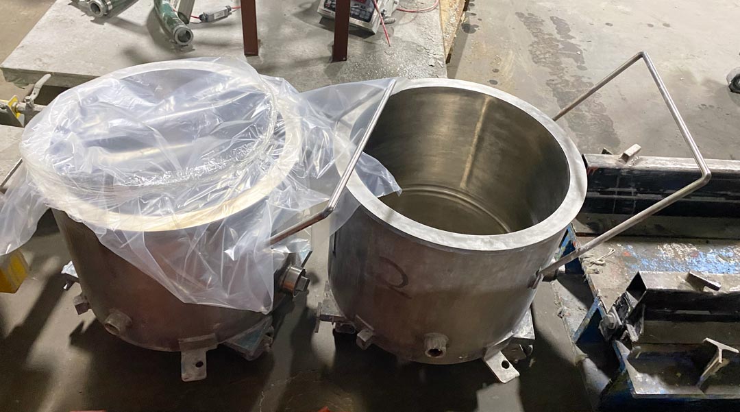 • 40-Gallon NEW jacketed mix can for use with a Ross 40-Gallon vacuum mixer and also suitable for use with a Ross dicharge press. Made from stainless steel.