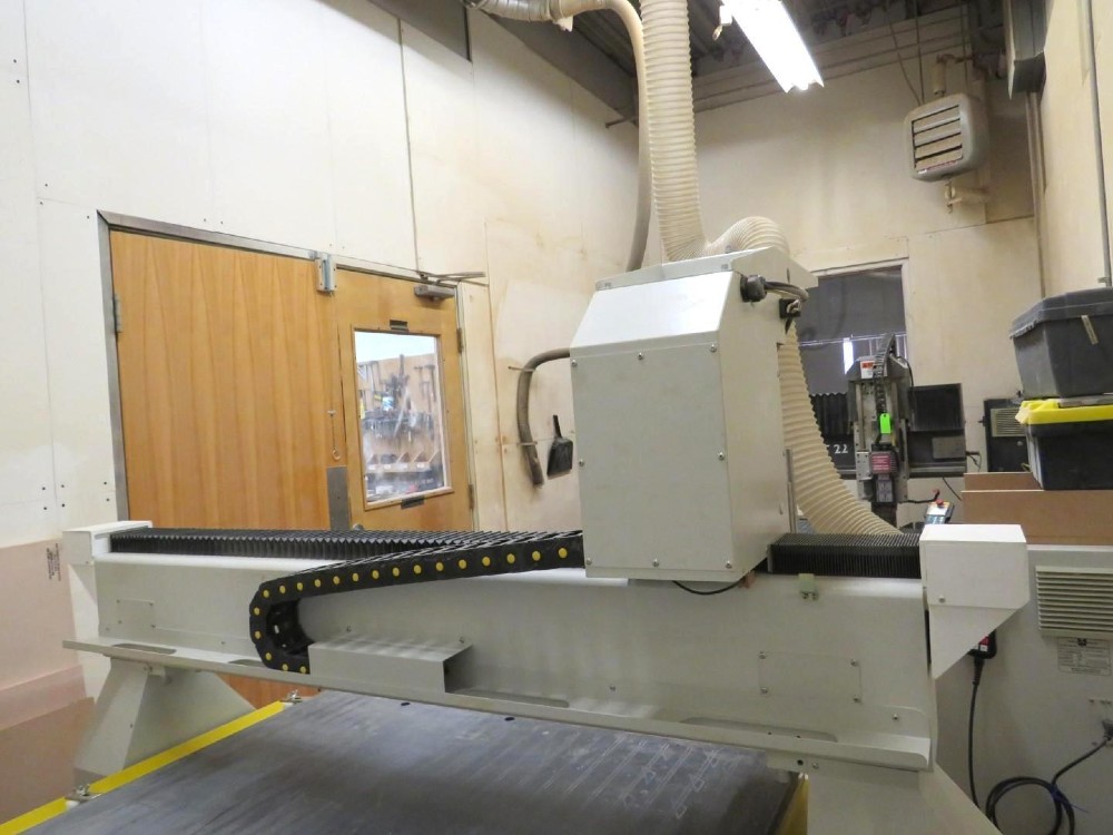 60” X 120” CNC Router with Handheld Pendant Control, Ball & Screw Drive System on All (3) Axes, 12 HP Automatic Tool Changer, Fully Programmable Speeds from 6K - 24KRPM, (8) ISO 30 Tool Holders, (8) ER32 Collets, Pneumatically Operated Dust Hood with Concentrated Air Flow, (2) Calibration Pads, High ...more