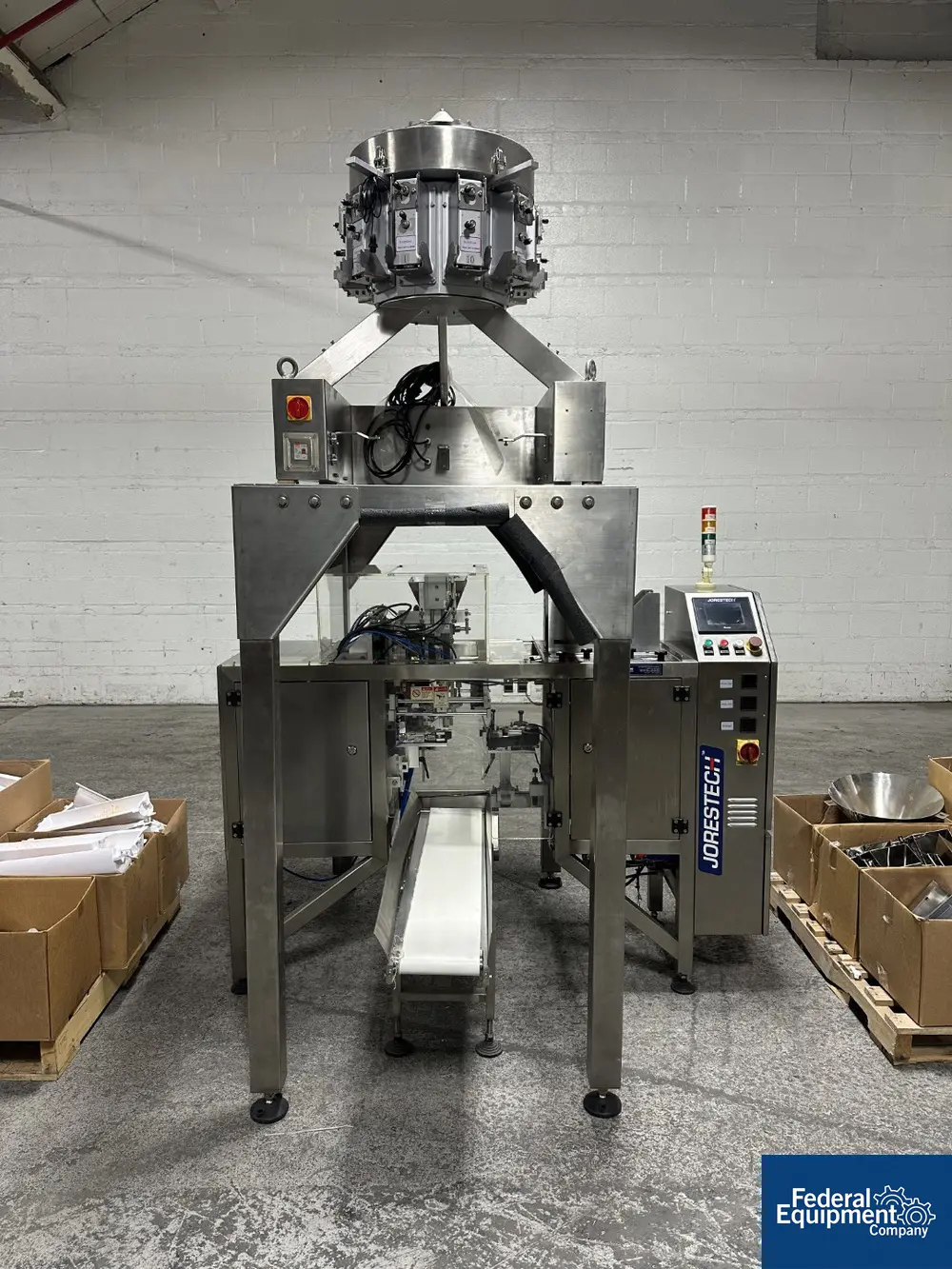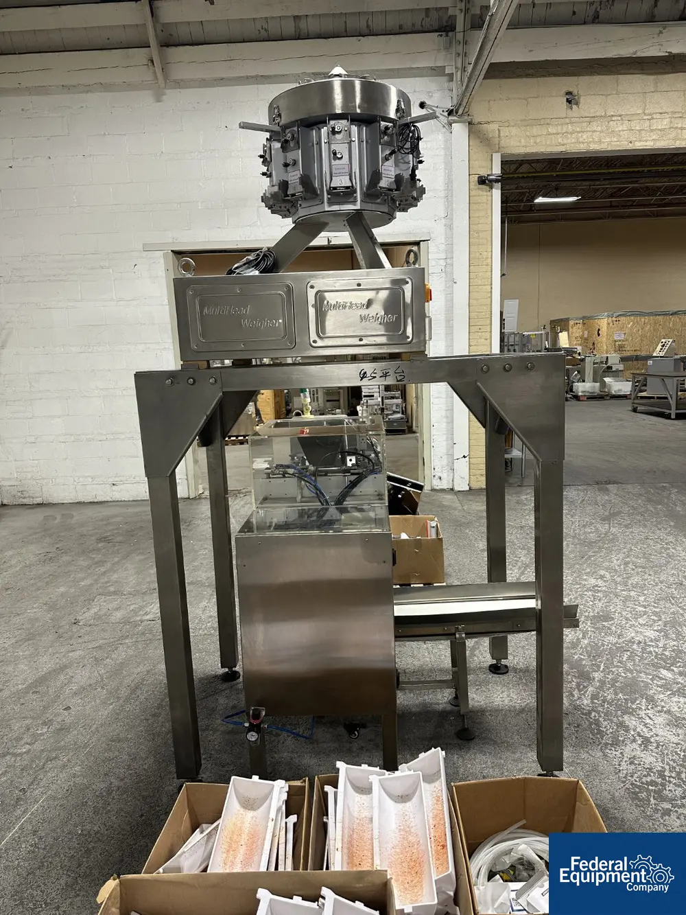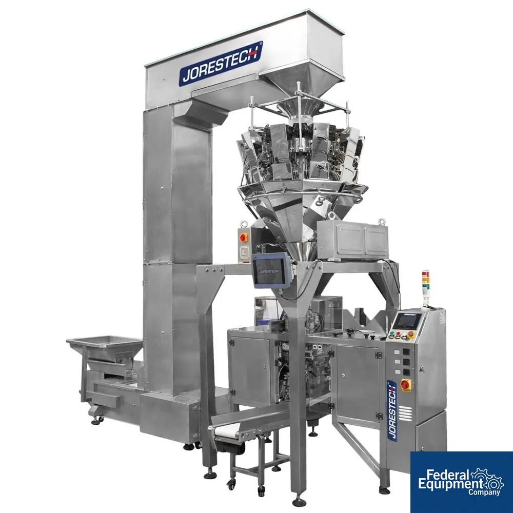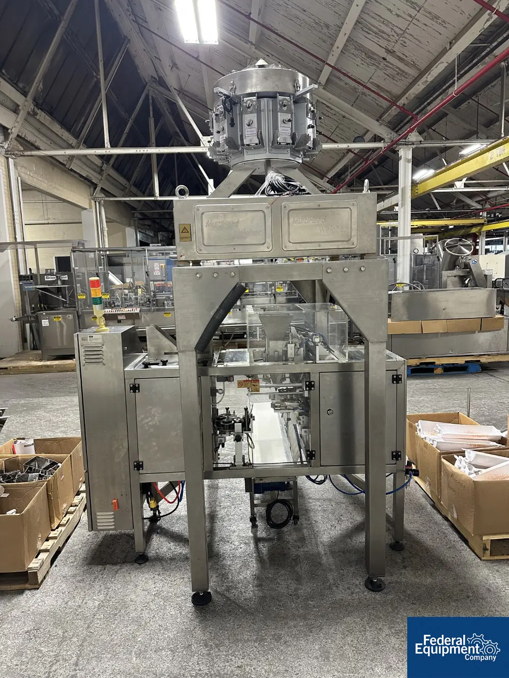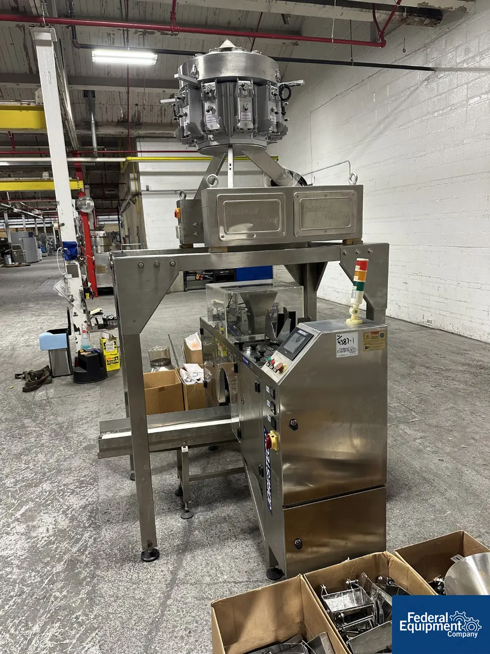 Used Technopack vertical form, fill, and seal bagging line with (10) head buck scale, consisting of the following: Z-style bucket elevator with stainless steel enclosure and plastic buckets. (10) head radial head bucket scale, stainless steel buckets, and chutes. Mini Doypack vertical filler, designed to fill pre-formed vertical stand-up zipper bags, with a stainless steel frame and an operator touch screen. Stainless steel framework for the bucket scale.