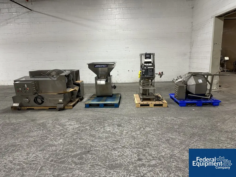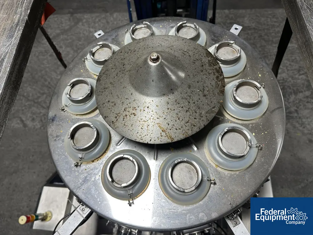 Tea bag automatic filling machine with 12" diameter X 24" deep conical shaped hopper, discharges to rotating turntable with (4) 1" diameter pockets discharging to 3" wide forming tube, discharges to 1-1/2" wide fill head to 4" wide rotating heat sealer and cut off knife assembly. Includes automatic feed system for ...more