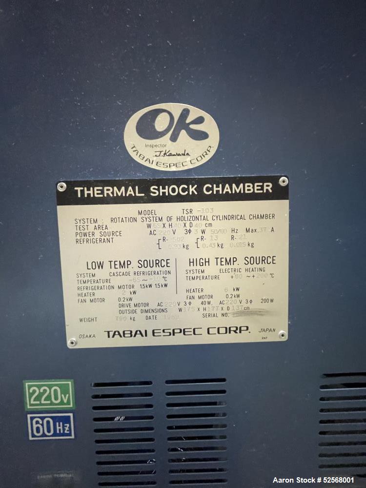 used- tabai espec corp, thermal shock chamber, model tsr-303, rotation system of horizontal and cylindrical chamber, test area: 65 cm x 40 cm x 40 cm, 10 deg c to 200 deg c, r-502 refrigerant.