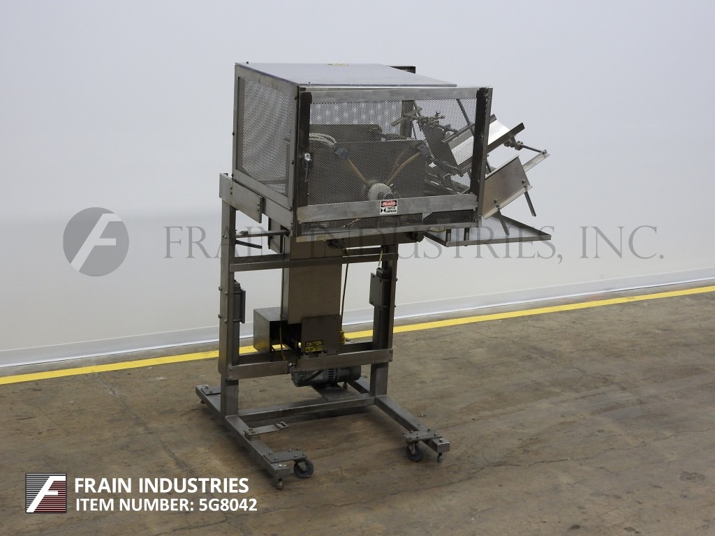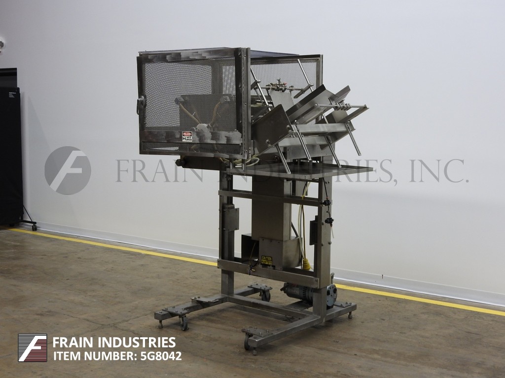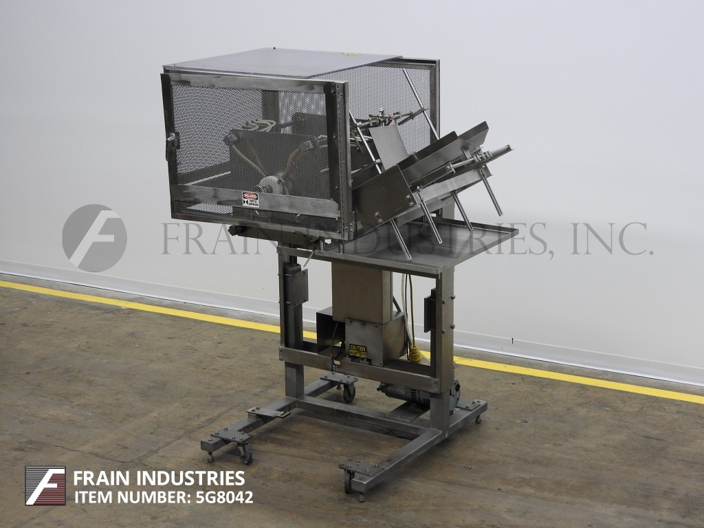 Thiele, automatic, rotary feeder. Rated from 10 to 400 picks per minute – depending on materials, application and machine configuration. Product size: 1½" to 18" in Length; 1½" to 20" in Width. Equipped with 18" long magazine, with (4) head, rotary vacuum suction cup pick n place, safety guarding, vacuum pump and motor drive. Control switch for vacuum on / off and push button start. Mounted on "H" style base frame.
