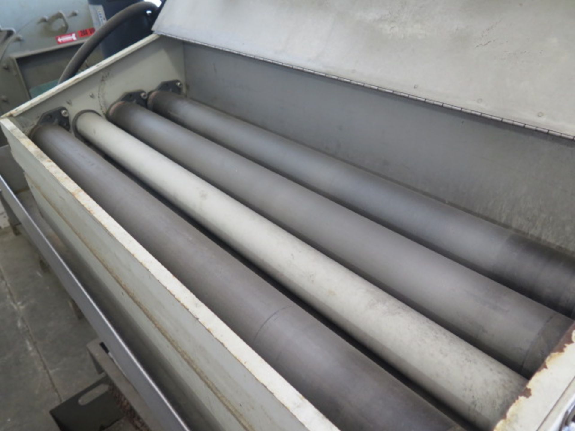 Timesavers #19MWT-DDDD-60, deburring / finishing machine, 19" x 60" abrasive belt, 6-20 FPM, 38" passline, dual infeed/ outfeed holddown rolls, 2012