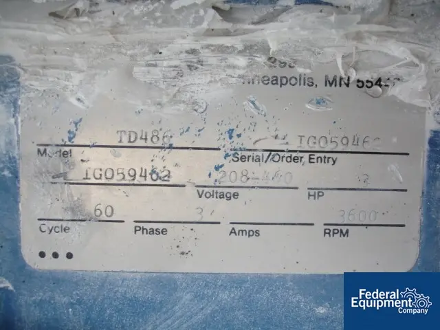 SERIAL. H6195, MODEL. 84, NOMINAL AIR FLOW. 700 CFM, INLETS. (2) 4", FILTER TYPE. BAG, MOTOR, HORSEPOWER. 3, MOTOR, VOLTAGE. 3/60/230/460.