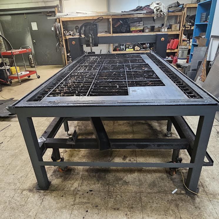 Physical dimensions are roughly 130"x70" for the entire table. Cutting area is 60"x120"., 125Amp 460v power Lincoln Flex Cut Plasma - 50ft torch cord length -- currently has ~9000 pierces on it., 5x10 table with lower reservoir for water storage, rebuilt in 2023: new servo motors, torch head, plasma power source, cnc ...more