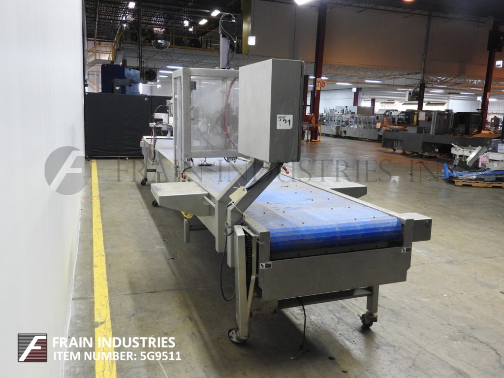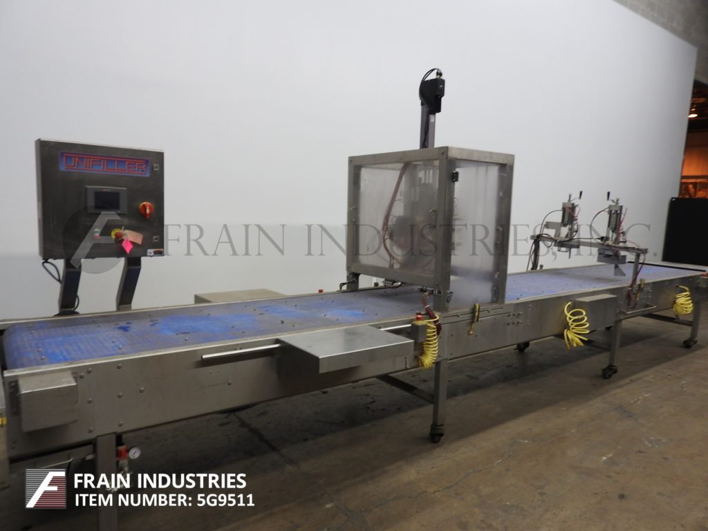 Unifiller, cheese cake finishing, decorating system. Rated from 10 to 30 cheese cakes per minute – depending on materials, application and machine configuration. Equipped with 300" long x 36" wide blue flexlink, dual lugged product conveyor set on 12" centers with (2) application stations, the first has (2) 360 Deg nozzles for the application of flavored toppings to the top layer on (2) cheese cakes, second has (2) diving, twisting and lifting rosette heads both running at the same time, the twisting enables you to make tall rosettes and is adjustable for how high and also to drag the rosettes into each other for unique patterns. Control panel has PLC Controller with touch pad controls and start, stop and e-stops. push buttons. Mounted on (8) leg base frame with casters.