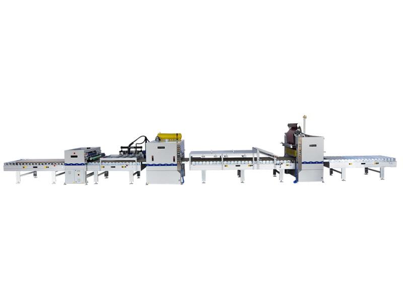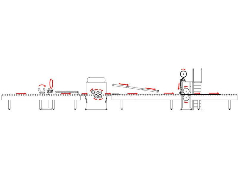 UNIMAK FLL 1400 PUR Flat Lamination Line with Flying Knife System4' Laminating Line for laminating flat panels with PUR glue. Laminating Station is a sheet and roll feed system with calender style Double Roll Press.Technical Characteristics: -- Line Speed from 5 - 25 MPM (15 - 82 FPM). -- Panel Width from 250 mm - 1,550 mm (10" - 48"). -- Panel Thickness from 3 - 60 mm (1/8 - 2-3/8"). -- Overall Line footprint 5,000 x 22,386 x 2,700 mm (16.4' x 74' x 8.8').Panel Types: -- MDF (finish sanded), HDF, chipboard, Plywood. Sanding is recommended. Minimum infeed temperature 18 C (64 F).Foil Types: -- Rolled Form PVC, high gloss, PET, P.P. (preconditioned with primer/corona); -- Rolled form CPL Laminate, max. 0.3 mm (1/64") thickness; -- Rolled form Decor Paper from 30 g/sq. m (3 g/sq. ft.); -- Sheet form Acrylic foil or HPL laminate.System Includes the following: -- 3 Meter (118") Long Conveyor & Adjustable Guide System (20) PVC coated rollers; retractable panel guide/fence for easy width adjustment; Mod. #s: "C3 130 HBD" -- Top & Bottom Brush Unit & Sword Brush Panel Cleaner Height adjustable brush system for cleaning panel surfaces; first rough cleaning with hair bristle brush, then micron grade cleaning with blower, vacuum system and Sword Brush which works in crosswise direction of material flow (caterpillar type); includes (2) 5" dust suction outlets; Mod. #s: "BS 130-PB" & FDB 130 -- 2.4 Meter (94") Panel Heater Conveyor and Adjustable Guide System Mounted on infeed conveyor, the heater preheats top of panels to between 35 - 40 C (95 - 104 F); width can be easily adjusted by retractable panel guide/fence; Mod. #s: "C2.4-130 PH" & "C2.4-130 AGS-2". -- Single Surface Glue Spreader for PUR with smoothing rollApplies PUR Hotmelt on flat panels. Application roller is motor driven and features independent frequency inverter redactor, smoothing roller follows application for High Gloss applications, built-in resistors allow independent electronic temperature control and oil-heating; Mod. #: "GS 140-R". -- MELTON E-DRUM -G-25-NPUR Hotmelt System includes: air-tight 200 L Drum Melter with NI120 temperature control - max. pumping capacity 130 kG/Hr @ 100 RPM, max. working viscosity 100,000 cps (100,000 mPa-s), max. working pressure 80 bar (1,160 PSI), max. working temp. 230 C (446 F); (2) heated hoses, 13 mm dia. (1/2") ; and (2) MS Series extrusion guns; Mod. #: B-DRUM PUR Melter. -- 4.5 Meter Conveyor, Adjustable Guide System & Laminate Sheet FeederTransports glued boards from Glue Spreader to Pressure Roller Station, driven by frequency controlled gear motor. Sheet Feeder mounted across top; Sheet Feeder feeds laminate sheets to top of boards; width can be easily adjusted by retractable panel guide/fence on conveyor; Mod. #s: "C4.5 ADG -130 HBD", & "SF 130".Double Roll Press (calender style)Laminating Station to laminate foils in sheets or rolls onto glue coated panel surfaces. Calender style Double Roll Press, Working width 250 - 1,300 mm