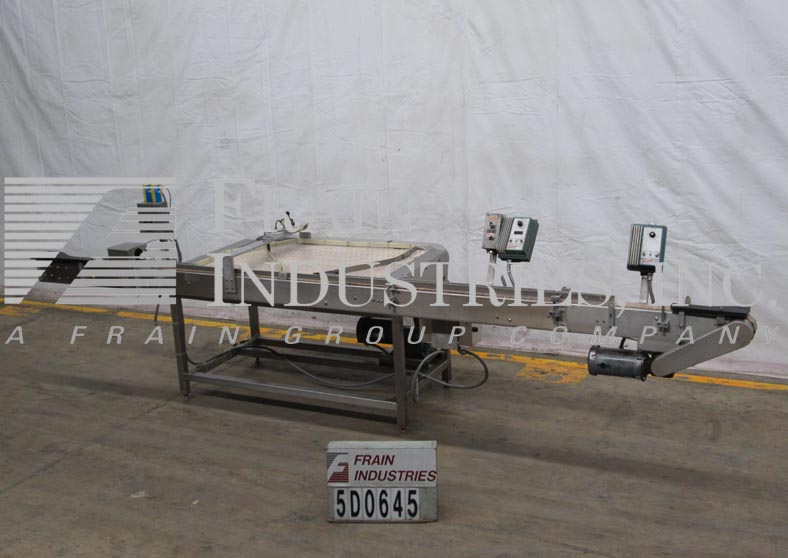 Stainless steel, five-belt, delron plastic accumulation table with (4) conveyors measuring 7 1/2"W x 34"L and (1) 3 1/4"W X 11’L in feed conveyor with 1 1/2"H guide rails. Equipped with Reliance Electric 3/4hp DC motor, accumulation start/stop, high cap/missing cap sensor indicator. Last used in a cosmetic operation.(Not pictured conveyor does have drive)