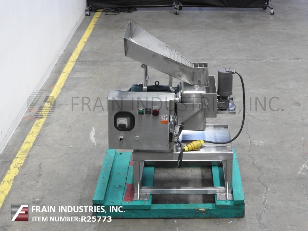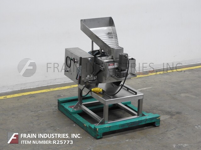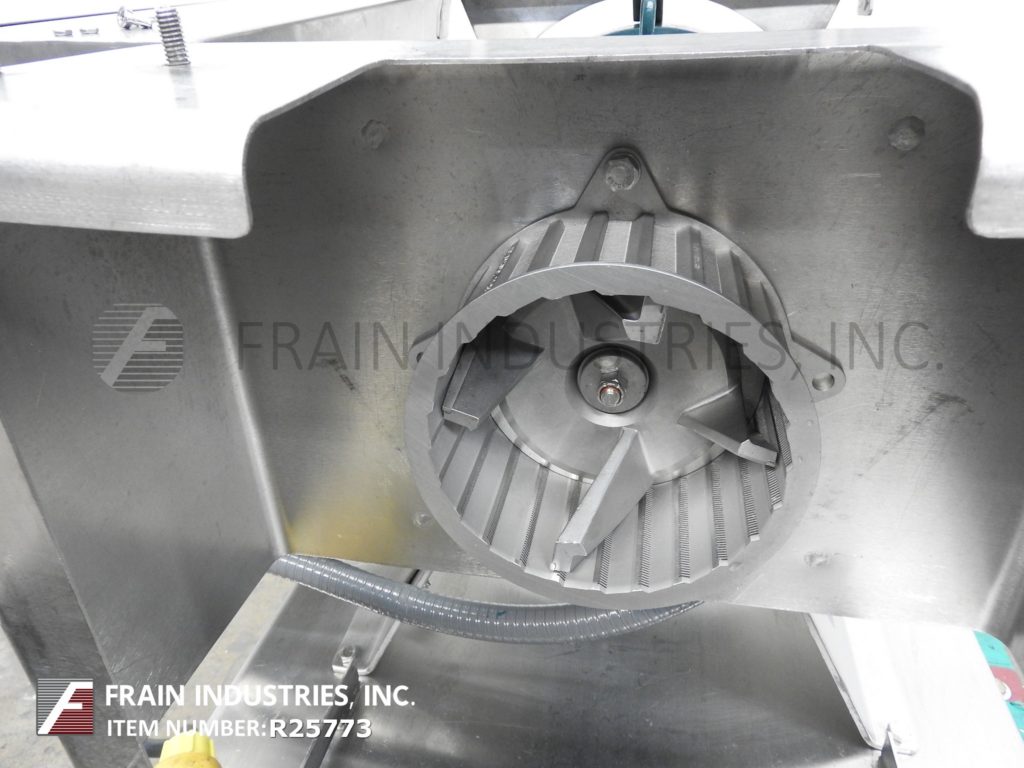 Urschel, model 3600, continuous operation processor designed for precise particle size reductions. Suitable applications such as chopping, flake cutting, granualting, pureeing and emulsifying with proper change parts. Cutting heads can process portions from 1/100" up to 2”. Unit is equipped with all stainless steel contact parts,16" long x 11" wide x 8" deep product hopper, 3” diameter feed screw, 6"diameter four blade impeller. Machine mounted on frame with locking casters. Change parts required to accommodate size range.