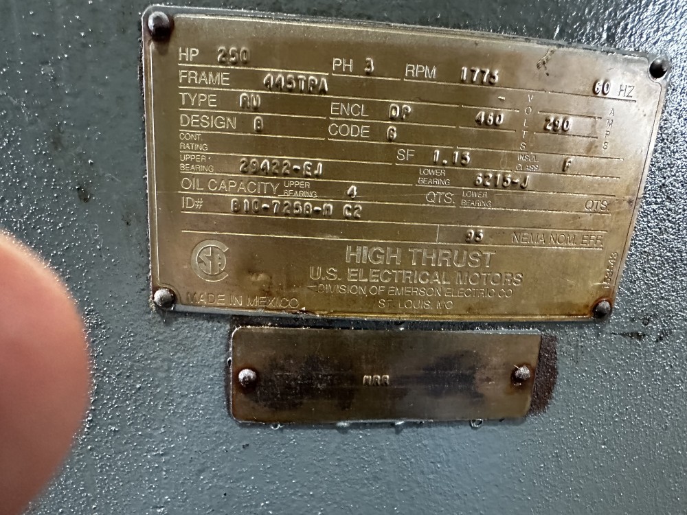 250 HP 1780 RPM U.S. Motors, Frame 445TPA, weather protected enclosure type 1, vertical pump motor, 292A, 460 Volts