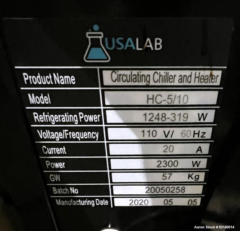 used- usa lab model hc-5/10 circulating chiller & heater. pump flow rate 30l/min. 5l reservoir capacity. refrigerating btu's 4,500 to 1,000. heating power 1000 w. batch# 20050258. 1/60/110 volt, 20 amp. built 2020.