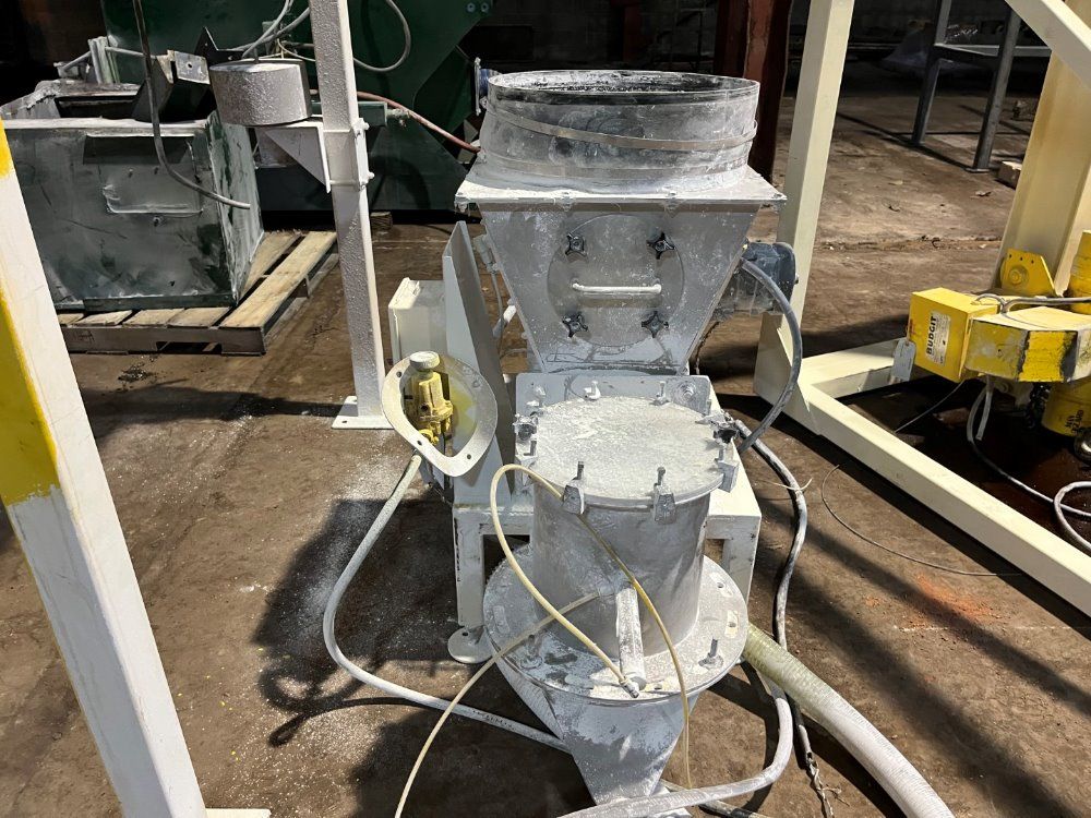 Used Dynamic Air bag breaker, Series 319, 304 stainless steel construction, approximately 36" wide, provision for (2) dust filters(less filters) with 1 hp, 230/460 volt blower, pulse jet with approximately 6 cu ft discharge hopper on 4 legs with 8" bottom outlet discharging into 5" diameter x 53" long horizontal screw ...more
