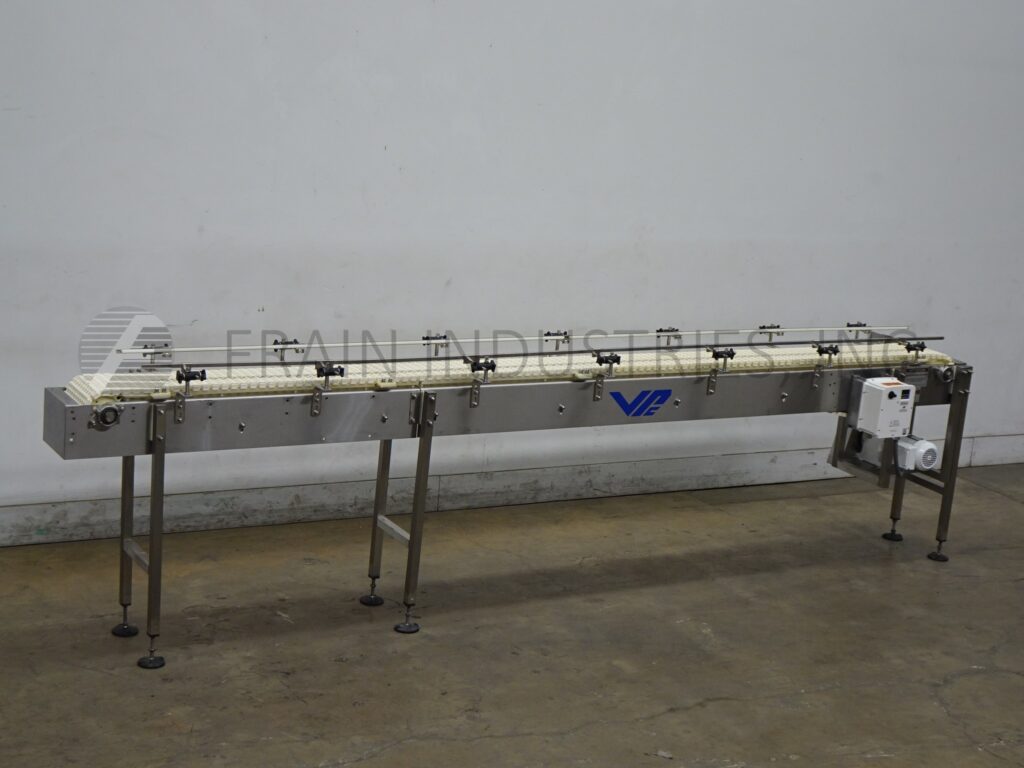 Van Pak, 10" wide x 178" long, stainless steel flexlink belt conveyor. Equipped with a 1 hp drive with variable speed control, roller transfer plate on infeed end and mounted on screw in leveling pads. Currently set at a 42" high infeed / discharge.