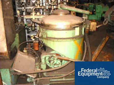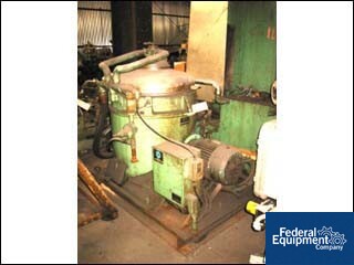 Used Veronesi Disc Bowl Self-Cleaning Separator Centrifuge, with centrifugal pump discharge of heavy phases, 3-way liquid-liquid-solid separation, Model BSGAB-440, 15 H.P. 230/460 volt motor drive, 6,000 RPM max. bowl speed, control system with timers for automatic operation, 9 liter sludge space, flow rate of 10,200 liters per hour maximum, (45 GPM), complete on base. serial# 52226, built 1975.